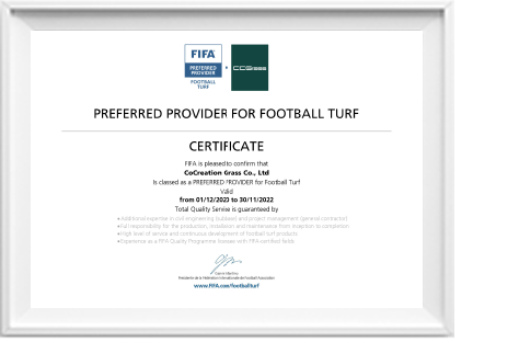 截至2020年,共創(chuàng)人造草獲得的FIFA場(chǎng)地認(rèn)證證書數(shù)量已達(dá)到300片,在國內(nèi)處于領(lǐng)先地位。